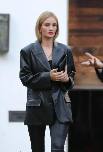 Хантингтон-Уайтли мастерски овладела искусством сочетания минималистичных вещей, и у нее точно есть, чему поучиться. На днях модель и возлюбленная Джейсона Стэтхэма отправилась на концерт в Голливуде. Девушка сделала ключевым акцентом образа трендовую черную кожу и выбрала объемный жакет, облегающие брюки с разрезами, клатч Hunting Season и босоножки Amina Muaddi, украшенные кристаллами Swarovski.