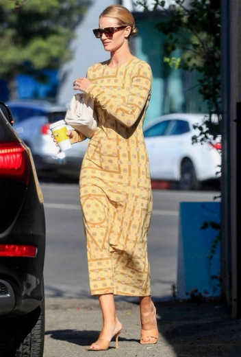 Даже на обычную вылазку за едой и кофе Роузи старается одеться на все сто: супермодели удается оригинально сочетать простые фасоны и лаконичные модели в одном образе — так, что ей требуется минимум аксессуаров для того, чтобы подчеркнуть аутфит. В этот раз Роузи подобрала легкое светло-желтое платье с принтом и дополнила его любимыми босоножками с квадратным носом и массивными темными солнцезащитными очками. Однако, кажется, папарацци привели супермоедль в некоторое раздражение: хмурящаяся Роузи — редкий случай стритстайл-хроники.
