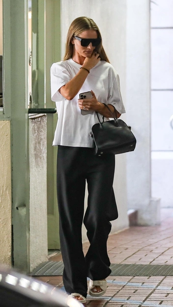 Восхищаемся, как топ-модели удается носить простые вещи и выглядеть в них бесподобно. Но Роузи Хантингтон-Уайтли намекает, что даже простая белая футболка должна быть выполнена из плотных материалов, которые придадут ей эффектности. Лаконичный верх она дополнила струящимися шелковыми брюками, которые также отвечают в образе за роскошь. Выход знаменитость завершила сандалиями, очками и сумкой.