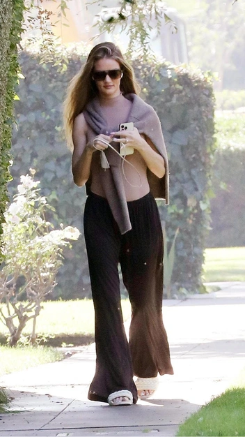 Роузи Хантингтон-Уайтли — та самая девушка, которой удается выглядеть стильно и дорого даже в повседневной одежде. Например, недавно она была замечена в базовом боди бежевого цвета и трикотажных расклешенных брюках. На плечи модель накинула кашемировый свитер, а в качестве обуви выбрала белые сабо на плоском ходу. Выглядит звезда эффектно за счет качества вещей: все они выполнены из плотных материалов и выигрышно подчеркивают фигуру, не показывая изъяны.