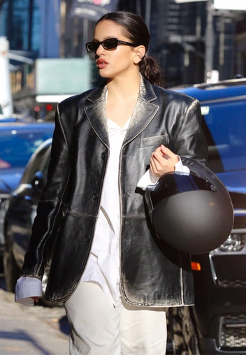 Кожа уже несколько сезонов не выходит из списка трендов и теперь официально считается не просто трендом, но и частью повседневного гардероба женщины. За время главенствования этой тенденции мы научились носить ее десятками разных способов, в том числе и с вечерними нарядами. Певица Розалия тоже обожает кожаные вещи, и особенно стильно в ее образах смотрится потертый кожаный пиджак прямого кроя. Его девушка решает сочетать с тотал-уайт образом — свободными брюками, оверсайз-рубашкой и светлыми ботинками.