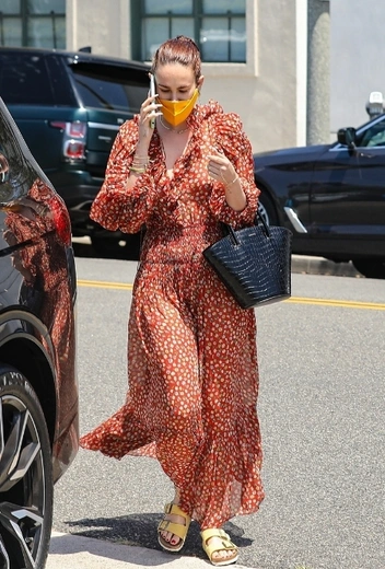 Среди всех принтов цветочная расцветка пользуется наибольшим спросом среди представительниц звездного стритстайла: с ней даже повседневные образы получают подчеркнуто романтическое звучание, обретая свежесть и колорит. Румер Уиллис предпочитает флоральный принт в летящем чайном платье — именно эта модель является абсолютным фаворитом в сезонном гардеробе знаменитости. Дочь Деми Мур выгуливает наряд в насыщенном красном оттенке с оборками, который дополняет биркенштоками, черной кожаной сумкой и ярко-желтой защитной маской.