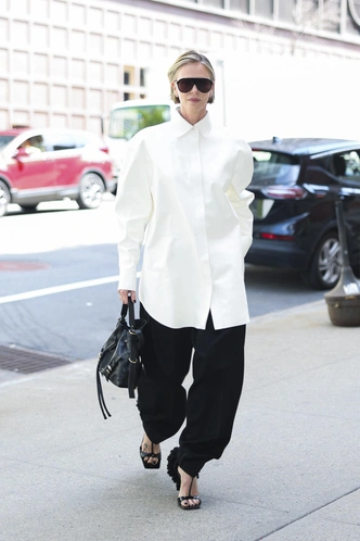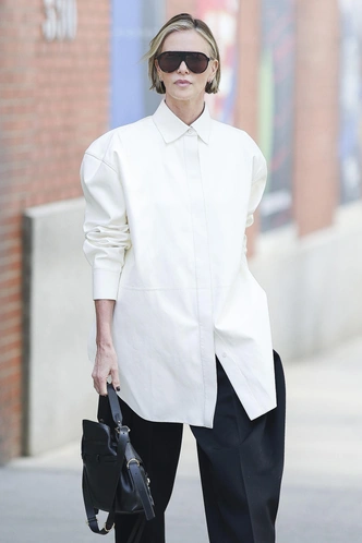 Шарлиз демонстрирует, как «мужская» белая рубашка превращается в главный акцент женского гардероба: оверсайз‑посадка, жесткий хлопок и четкий воротник создают архитектурный силуэт без единой лишней детали. Объемный верх актриса уравновешивает черными брюками и минималистичными босоножками с фактурным декором, а крупные маскулинные очки и кожаная сумка добавляют нужную дозу драматизма — получается тот самый современный power‑look в духе Chanel, где комфорт и строгая геометрия работают на один эффект: вы в центре внимания, хотя на вас всего лишь белая рубашка и черные штаны.
