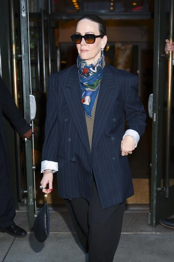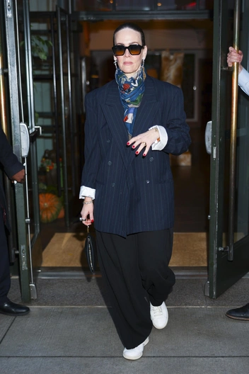 Сара Полсон была замечена в районе Мидтаун в Нью-Йорке, где она предстала в синем пиджаке в тонкую полоску, дополненном изящным шелковым шарфом. Образ удачно гармонирует с легкими белыми кедами и стильными солнечными очками — это наглядно демонстрирует ее умение сочетать классику и комфорт — ключевые черты фирменного стиля актрисы. Этот выход отлично вписывается в многолетнюю эволюцию образа Полсон, которая часто выбирает минималистичные, но выразительные образы, подчеркивающие ее индивидуальность.