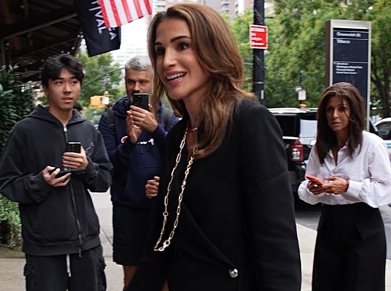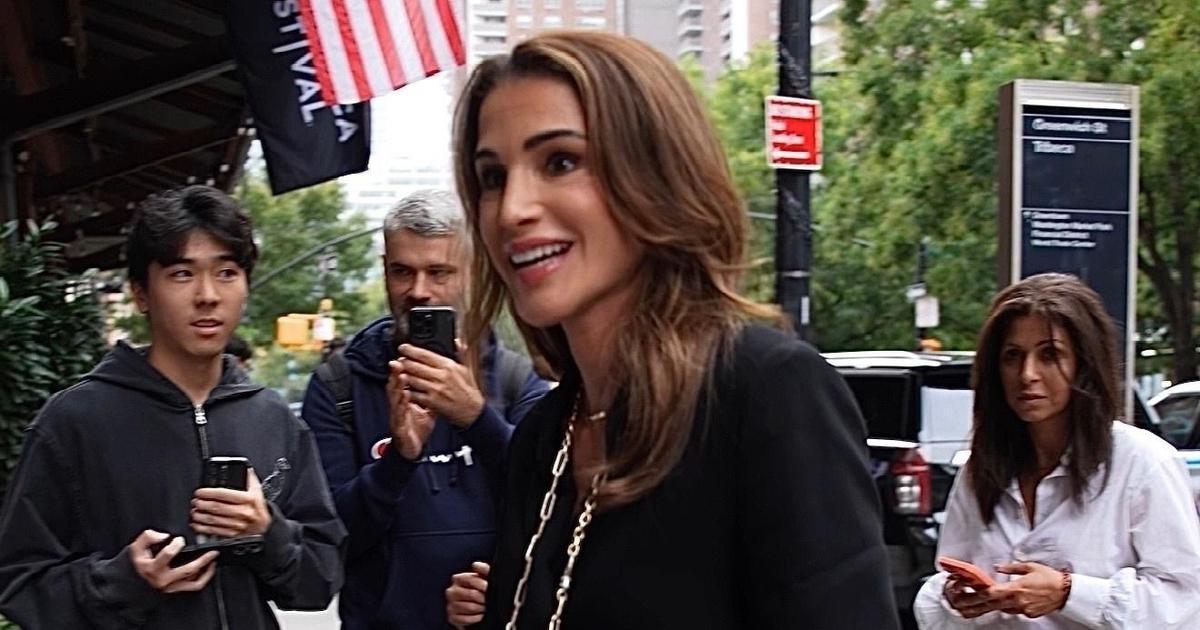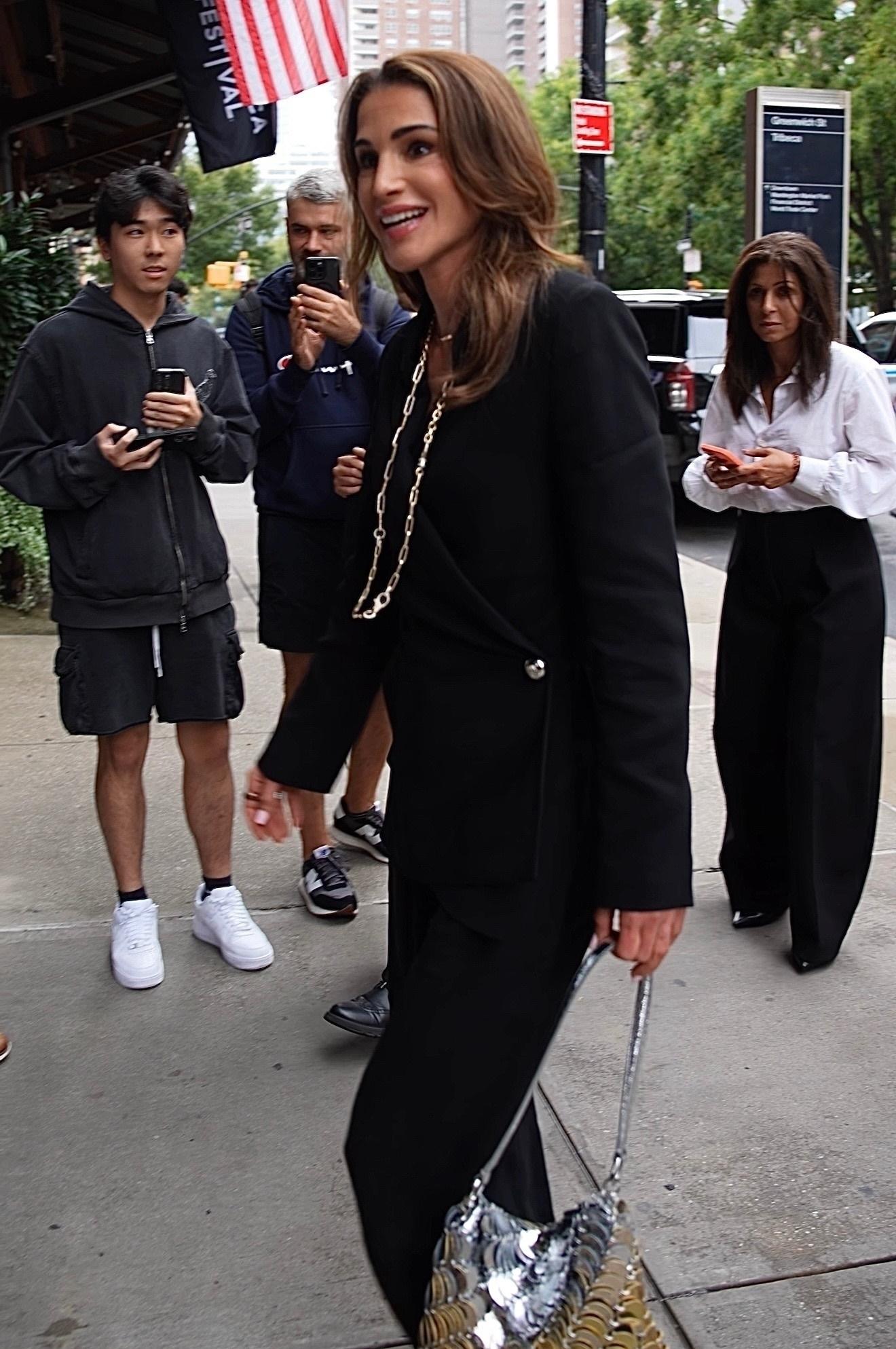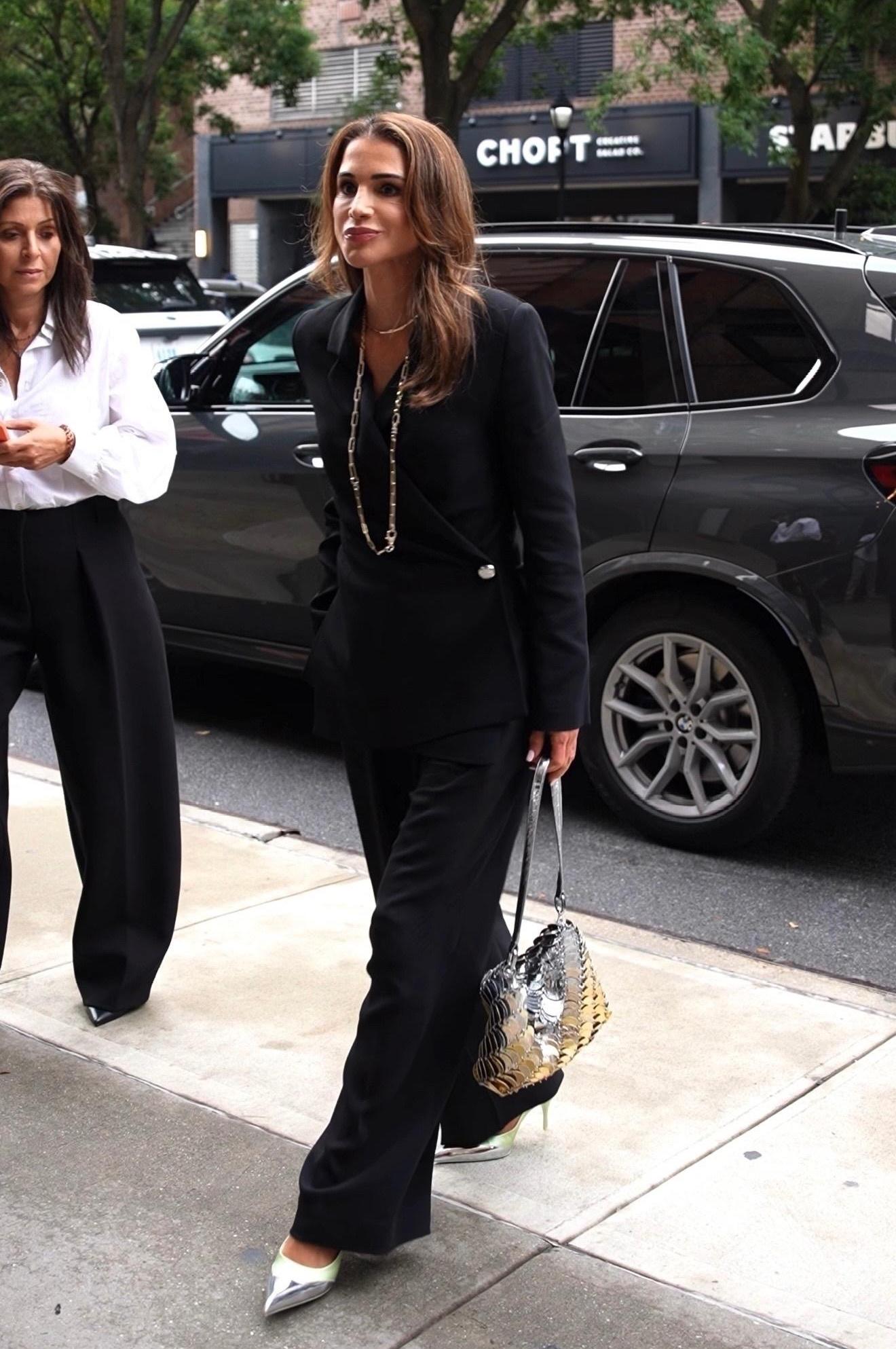 Коллекция сумок королевы Рании — наша римская империя, ведь в шкафу монарха значатся самые трендовые, стильные и дорогостоящие модели. Например, эта с имитацией монет от Paco Rabanne — сумка с отсылкой к кодам бренда появилась на показе SS/25 и стала очень популярна. Для такого яркого аксессуара Рания подобрала образ в черном цвете и лодочки с серебряным мысом, перекликающимся с сумкой.