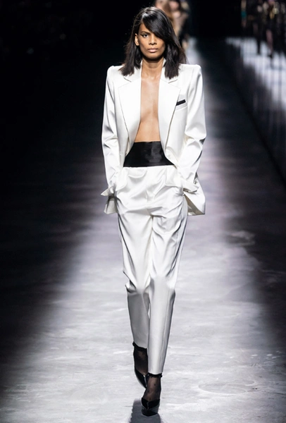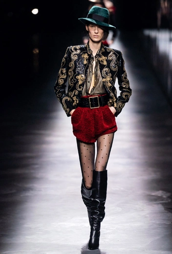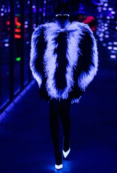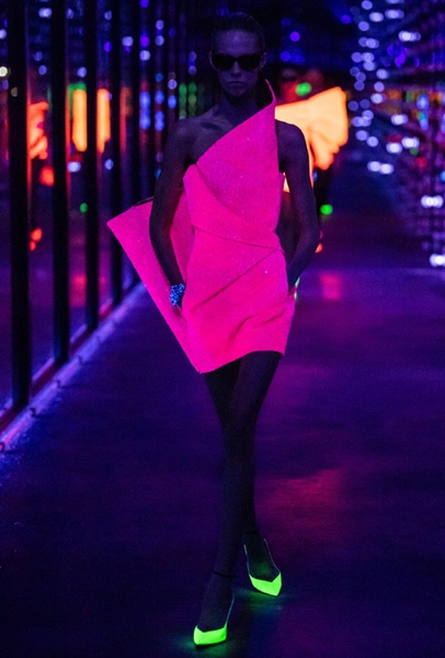 Главными акцентами новой коллекции стали силуэты 70-х и увеличенная линия плеч. Креативный директор Энтони Ваккарелло разделил показ на две смысловые части. Первый прошел в привычном для дизайнера ключе – со строгими оверсайз-жакетами, мини-платьями с крупными акцентами-бантами и декором из пайеток. Основу второй составил неон: модели дефилировали под пульсирующий свет ламп в темноте, одетые в пышные укороченные шубы и яркие мини-платья, дополненные светящимися флуоресцентными лодочками.