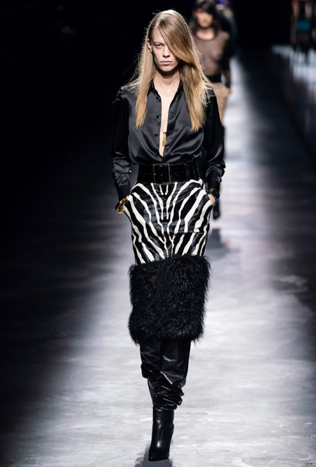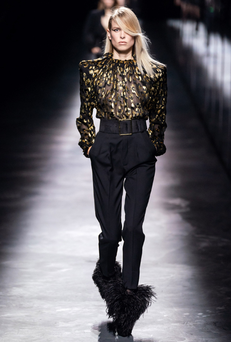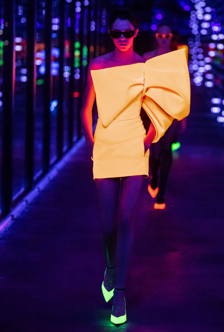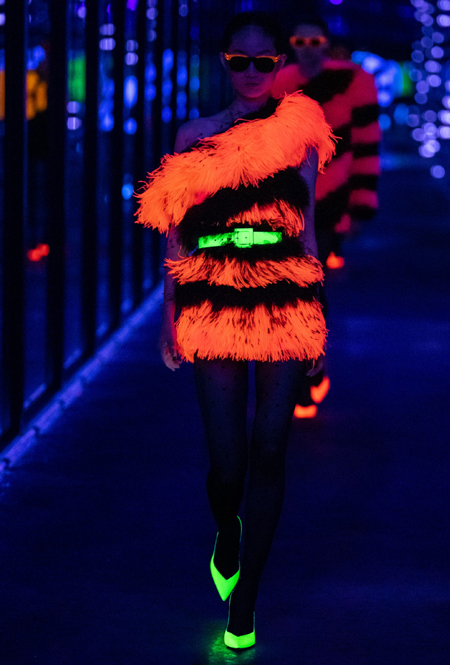 Главными акцентами новой коллекции стали силуэты 70-х и увеличенная линия плеч. Креативный директор Энтони Ваккарелло разделил показ на две смысловые части. Первый прошел в привычном для дизайнера ключе – со строгими оверсайз-жакетами, мини-платьями с крупными акцентами-бантами и декором из пайеток. Основу второй составил неон: модели дефилировали под пульсирующий свет ламп в темноте, одетые в пышные укороченные шубы и яркие мини-платья, дополненные светящимися флуоресцентными лодочками.