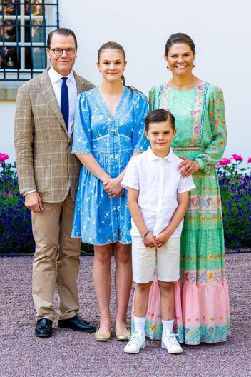 Принцесса Виктория часто носит национальные наряды и цветочные принты. На фотосессии к своему дню рождения она примерила нечто среднее: платье макси с флоральными паттернами в ярком зеленом оттенке. Не отстает и будущая королева Швеции принцесса Эстель: дочь Виктории надела платье с цветами, но в голубом цвете.