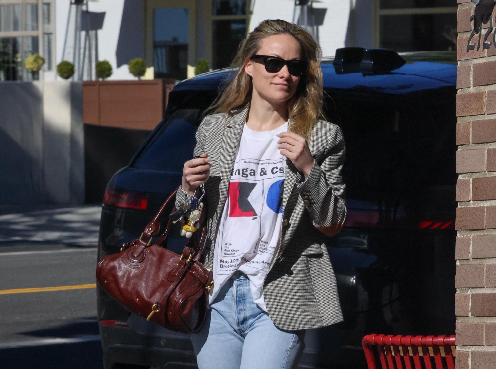 Оливия Уайлд демонстрирует самое беспроигрышное весеннее комбо — жакет плюс деним и удобные кроссовки. Клетчатый блейзер мужского кроя, белый принтованный лонгслив, светлые прямые джинсы и простые кеды собираются в образ, который одновременно выглядит как базовый и как тщательно продуманный Pinterest‑аутфит: здесь и тренд на интеллектуальную многослойность, и актуальная посадка брюк, и расслабленность, о которой так много говорят стилисты и дизайнеры.