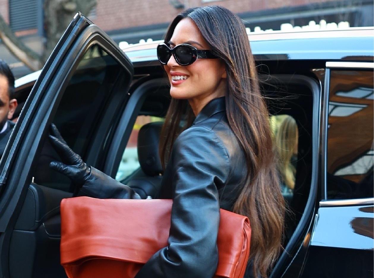 Оливия Манн показывает самый модный способ носить макси‑сумку: не на плече и не в руках, а как мягкий скульптурный клатч, прижатый к корпусу поверх строгого total black. Огромная терракотовая модель становится главным цветовым акцентом к кожаному жакету, классическим брюкам и остроносым лодочкам, превращая практичный аксессуар в фешн‑заявление в духе тренда на оверсайз‑клатчи, которые носят именно так — сложенными и зажатыми под рукой, будто вы определились с выбором сумочки в самый последний момент.