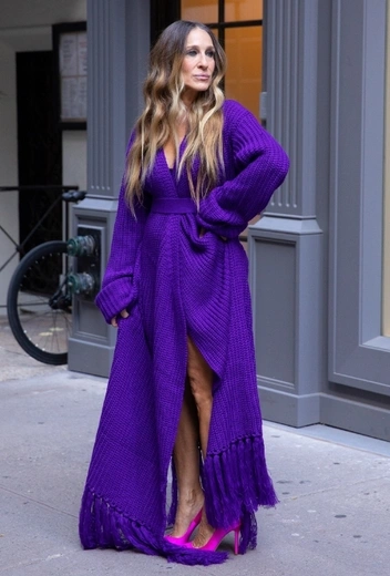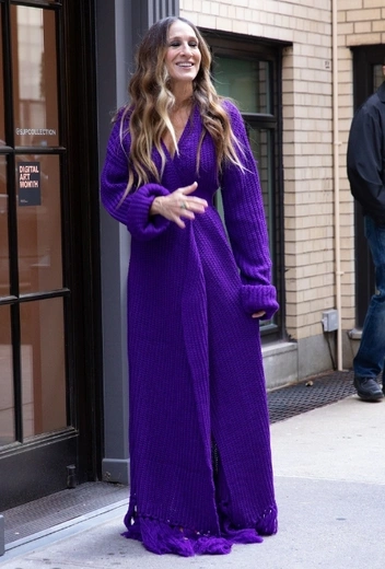 Спустя много лет после окончания съемок культового сериала «Секс в большом городе» Сара Джессика Паркер продолжает удерживать за собой статус первой fashionista модной столицы США — в ее выходах мы до сих пор чувствуем стиль и вкус Кэрри Брэдшоу, который принес ей мировую славу. В отличие от своих коллег по цеху, знаменитость уже переключилась на осеннюю волну и соответствующий ей гардероб, а во время недавней фотосъемки на улицах Нью-Йорка продемонстрировала удачный вариант повседневного платья для этого сезона. Сара примерила трикотажное платье макси с запахом в ярком фиолетовом оттенке, которое дополнили туфли-лодочки цвета фуксии и мягкий нюдовый макияж.