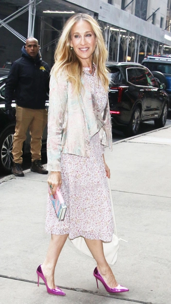 Сара Джессика Паркер переняла у своей героини Кэрри Брэдшоу из «Секса в большом городе» лучшее, а именно — любовь к туфлям. Они настолько ее очаровали, что она создала свой бренд и продолжает славиться самыми необычными и стильными моделями. Как бы мы не относились к стилю звезды, ее отношениям с обувью можно позавидовать. Взгляните на ее выход: Паркер дополнила платье с сиреневыми цветами фиолетовыми остроносыми лодочками на шпильке с эффектом металлик, что актуален весь этот год. Нравится нам и выбор сумки актрисы: белоснежная модель в форме пельменя на тонком шнурке стала эффектным завершением образа.