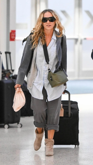 Сара Джессика Паркер часто напоминает нам Кэрри Брэдшоу, героиню сериала «Секс в большом городе», с ролью которой она не расстается долгие годы. Стиль актрисы такой же необычный и смелый, что доказывает ее последний выход. Звезда прибыла в аэропорт Нью-Йорке в объемной длинной рубашке и свободных джинсах, штанины которых она небрежно подвернула до икр. В качестве обуви Сара Джессика Паркер выбрала сапоги-слоучи и завершила образ сумкой и эффектными очками.