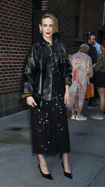 В последнее время Сара Полсон демонстрирует ультрамодные образы, которые мы предлагаем повторить и вам. Например, недавно знаменитость была замечена в эффектном аутфите. Для вечернего выхода она выбрала черное полупрозрачное платье, усыпанное крупными пайетками, и дополнила его брутальным кожаным бомбером. Завершили выход лакированные лодочки, небольшой клатч и серьги.