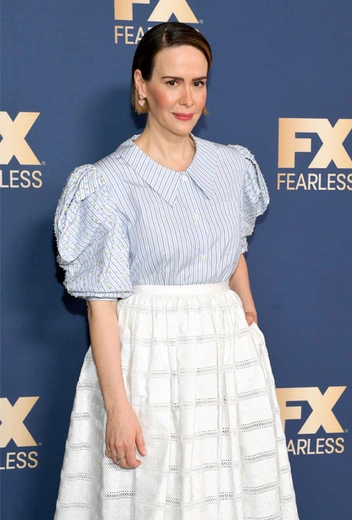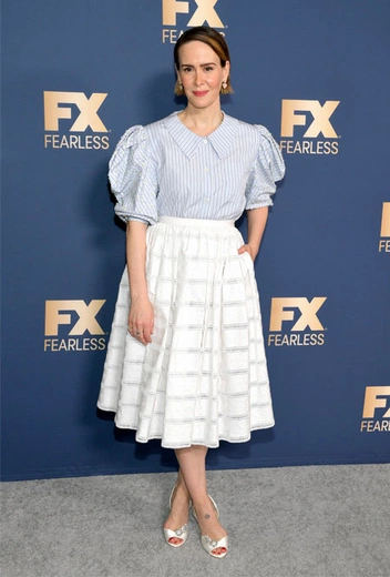 Стиль Сары Полсон выгодно отличается от нарядов многих селебрити из А-листа. Актриса не боится экспериментировать и пробует все: как наивные женственные платья, так и неожиданные авангардные решения. Удачным нарядом стал и образ, в котором она появилась во время пресс-тура фильма «Миссис Америка». Актриса выбрала ансамбль Miu Miu из блузки с вышивкой в виде цветов из кристаллов и пайеток и белую юбку из фая.