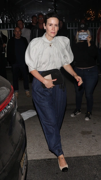 Сара Полсон собрала модный и эффектный образ, который будет уместен как в повседневном гардеробе, так и в вечернем. Актриса выбрала блузу с пышными рукавами, которую заправила в синие брюки-бананы с высокой посадкой. Аутфит завершили классические бежево-черные босоножки с закрытым мысом и небольшая сумка-клатч.