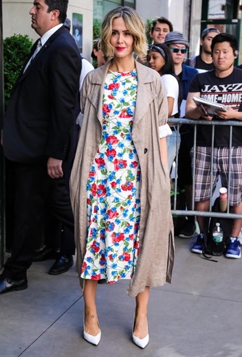 Звезда сериала «Американская история ужасов» (American Horror Story) Сара Полсон нашла легкий способ приспособить льняной плащ летом, просто подобрав к нему платье в яркий и крупный цветочный принт и оригинальные белые лодочки. Получилось мило и весьма практично, согласны?