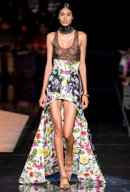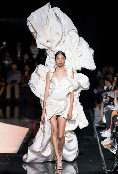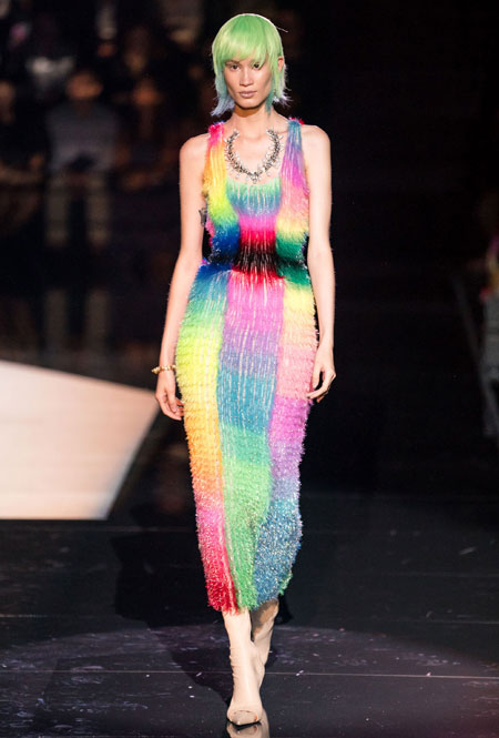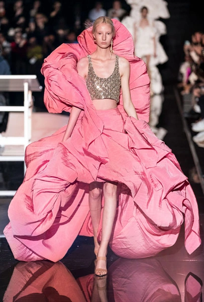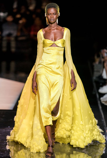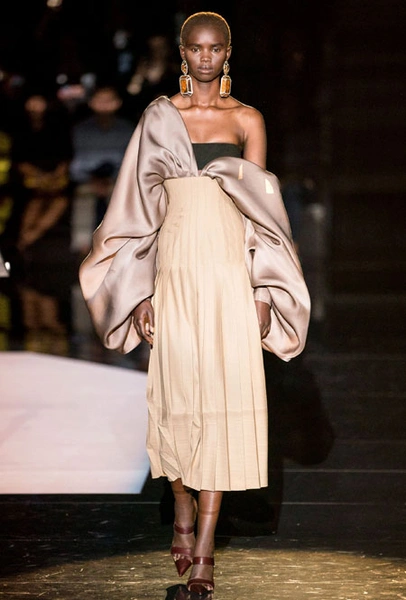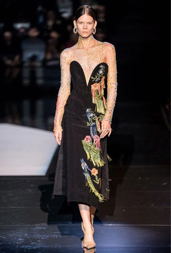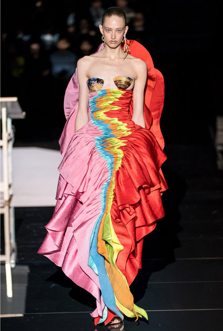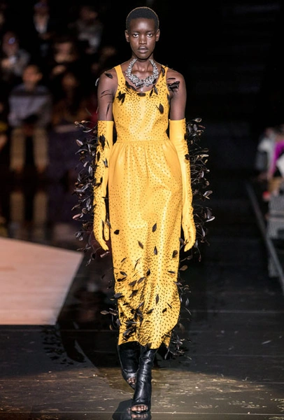 Кутюрный осенне-зимний показ превратился для культового дома в важное событие: коллекция стала дебютом нового креативного директора Дэниела Роузберри, который ранее занимал пост арт-директора в Thom Browne. Теперь 33-летний дизайнер вовсю показывает свои умения в коллекциях для культового бренда, не забывая о ключевом ДНК. Так в коллекции появился любимый самой Эльзой Скиапарелли сюрреализм: эксцентричный нейл-арт, парики из бисера и божьи коровки на теле модели. Помимо вечерних платьев дизайн-команда Роузберри также представила практичные пальто со вставками из кожи питона, велосипедки и костюмы в стиле милитари.