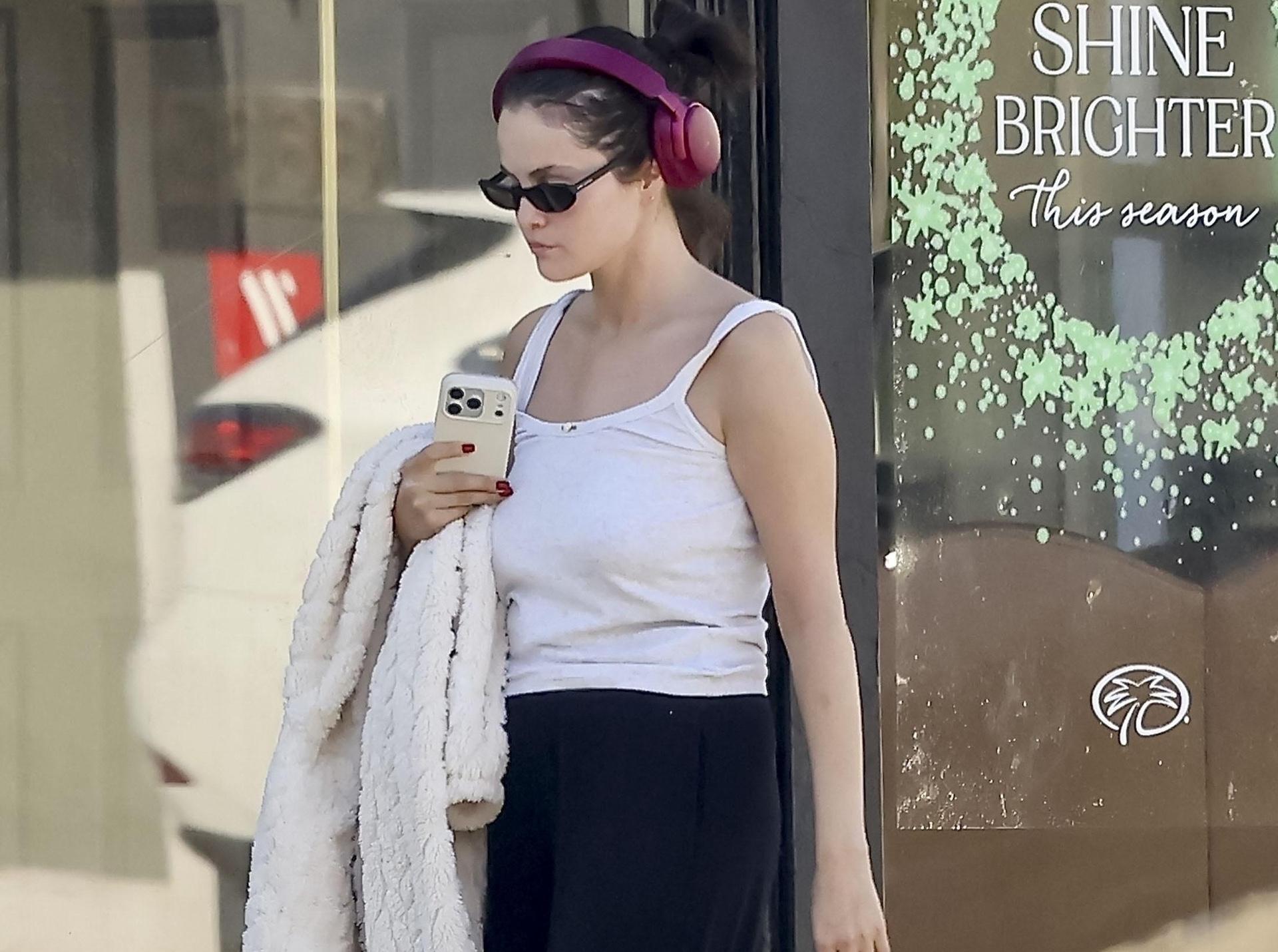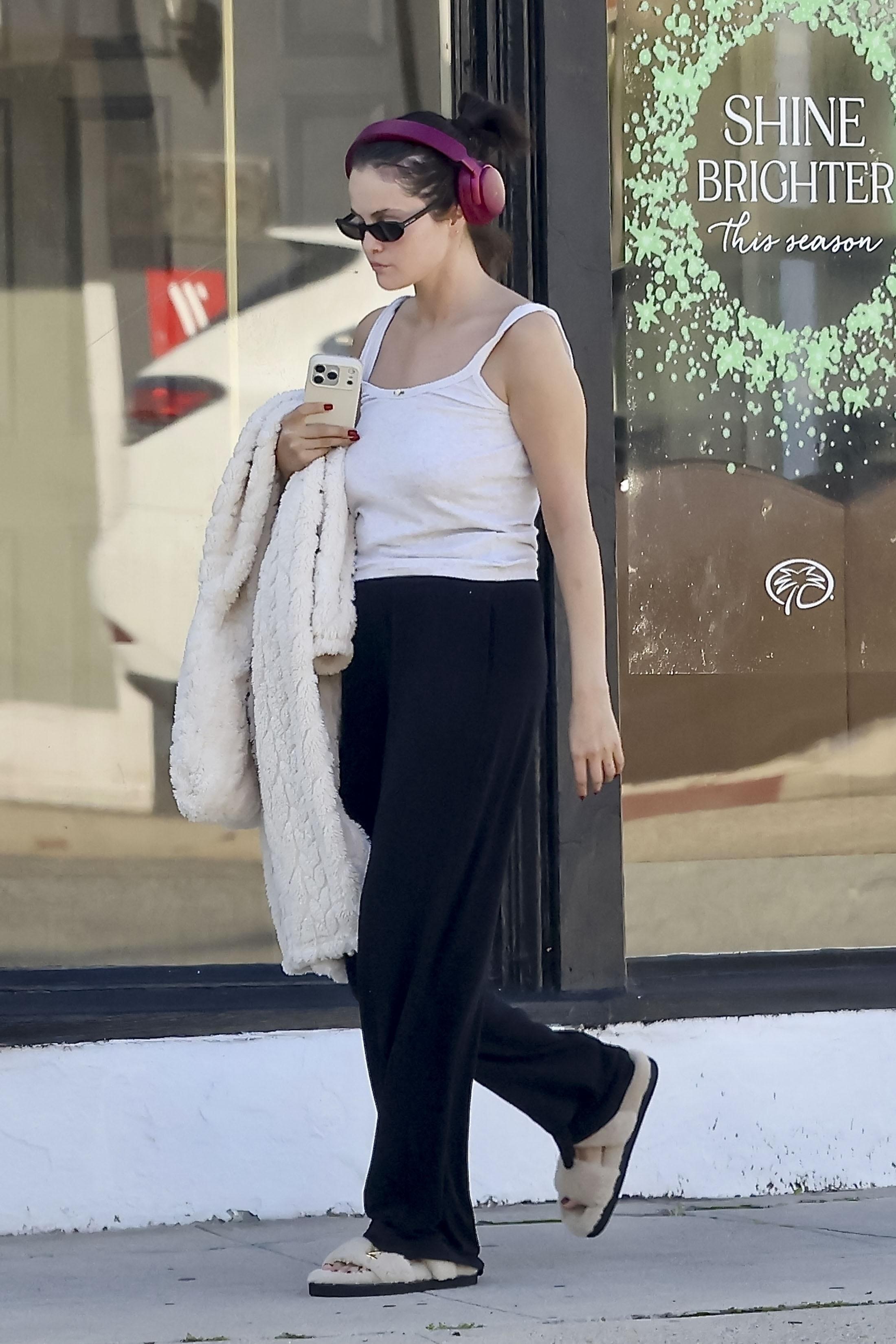 Селена Гомес начинает год правильно — с идеального аутфита для занятий спортом и прогулок после зала. Белая майка на бретелях и черные широкие спортивные штаны создают максимально простой и удобный комплект, который не сковывает движения. Меховые сандалии, объемные наушники и теплая шубка-тедди в руках добавляют уютного домашнего настроения, так что в этом образе одинаково комфортно и провести час на беговой дорожке, и забежать за кофе навынос по пути домой.