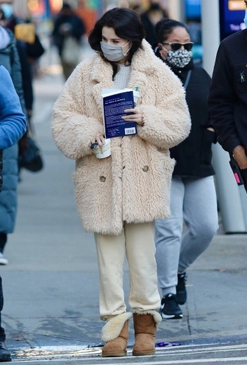 Последние выходы исполнительницы в центре Нью-Йорка — настоящая находка для тех, кто постоянно находится в поисках стильных решений для повседневного гардероба. Для съемок в сериале Only Murders in the Building Селена примеряет аутфиты по последней трендовой повестке. Последний из них звезда выдержала в кремовой палитре оттенков и предпочла исполнение в уютных мягких тканях: объемное пальто из искусственной шерсти Селена дополнила трикотажными брюками и коричневыми уггами, которые идеально подошли под прохладную городскую зиму.