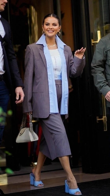 В последнее время Селена Гомес радует поклонников своими публичными образами: это не только хорошо подобранные платья, но стильные костюмы с трендовыми приемами. Например, недавно знаменитость появилась в многослойном аутфите, примерив белоснежный топ, голубую рубашку и костюм, состоящий и свободного пиджака и кюлотов. Кстати, присмотритесь к брюкам — певица последовала актуальному приему и надела под них пижамные шорты. Завершила она выход сабо, сумкой и украшениями.