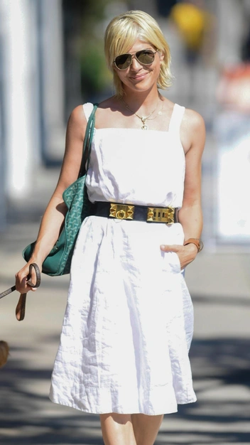 В летнем гардеробе каждой девушки есть свободный сарафан, от которого вы, вероятно, уже подустали. Выбрасывать его жалко, поэтому предлагаем вам повторить модный прием от Сэльмы Блэр. Знаменитость подчеркнула белоснежный наряд на широких бретелях акцентным широким ремнем из кожи с золотой пряжкой, что смотрится эффектно. Таким образом вы не только придадите привычному платью новое «звучание», но и акцентируйте внимание на талии, на случай, если она у вас мало выражена.