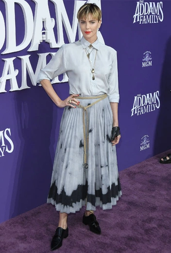 Сезон выхода фильмов ужасов накануне Хэллоуина объявляется открытым. 6 октября в Лос-Анджелесе состоялась премьера нового анимационного фильма о самой известной семейке Аддамс, чьи образы уже вошли в историю. В ленте голосом одной из главных героинь – матери Мортиши – говорит Шарлиз Терон. Она также пришла на премьеру анимационной картины, правда, решила выбрать наряд в пастельной гамме вместо готического стиля, который особенно любили члены семейки Аддамс. Актриса появилась на дорожке в классической голубой блузе, плиссированной юбке с эффектом тай-дай и дополнила наряд самым модным аксессуаром будущего сезона – поясом-веревкой.