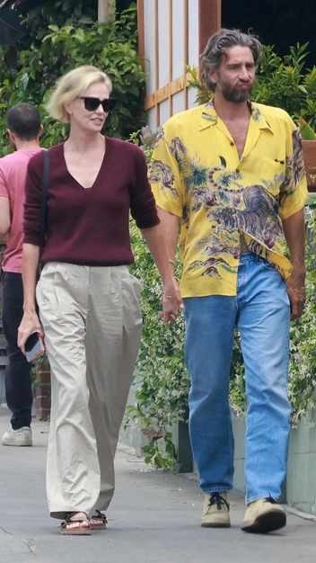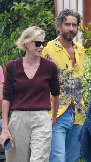 Для публичного выхода с новым бойфрендом Алексом Димитриевичем актриса выбрала расслабленный, но модный аутфит. Шарлиз Терон выглядит безупречно в бордовом кашемировом свитере, рукава которого она небрежно закатала. К нему она подобрала широкие брюки с защипами, кожаную сумку и солнцезащитные очки. На ноги знаменитость надела стильные коричневые сандалии с широкими ремешками.