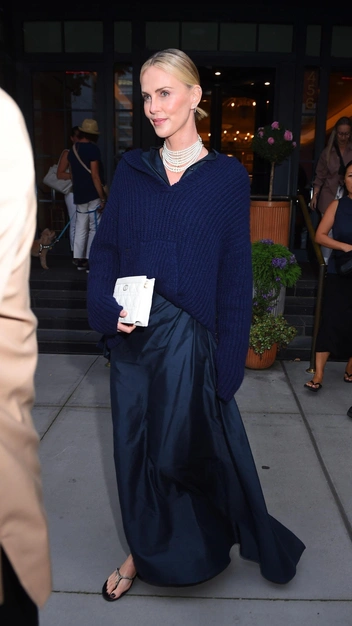 Шарлиз Терон выглядит сногсшибательно и модно. Нравится нам то, как эффектно она сочетает пышное вечернее платье в пол с базовым расслабленным свитером и вьетнамками, что стало трендом. Роскоши образу актриса придала аксессуарами и украшениями: белоснежный стеганый клатч Dior она дополнила многоярусным жемчужным колье, которое стало так популярно в этом году. Жемчуг является одним из любимых камней монарших особ, а теперь он становится частью коллекций самых стильных женщин мира.