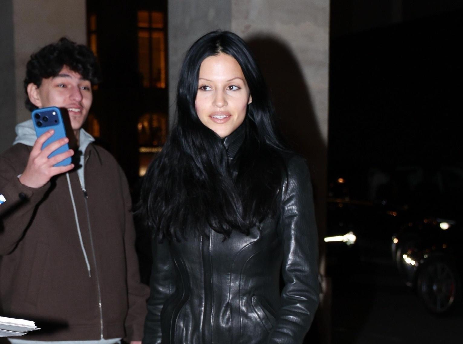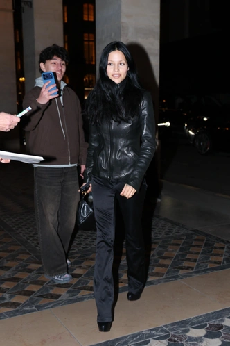 Габбриетт выбирает тот самый «рок‑шик» нулевых, который возвращается подиумы: струящиеся черные шелковые брюки‑клеш выглядят как часть вечерней пижамы, но в паре с приталенной кожаной курткой сидят по фигуре не хуже костюма. Миниатюрная черная сумка и остроносые ботинки поддерживают total‑black, благодаря чему блеск шелка выходит на первый план и превращает простой выход из отеля в кадр из старого клипа The Kills.