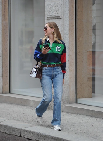 Так, Кьяра сочетала джинсы фасона буткат светло-голубого цвета с поло в полоску с длинными рукавами. Финалом образа стали кроссовки в стиле ретро, а главным акцентом — сумка Kelly из экзотической кожи в глубоком коричневом оттенке.