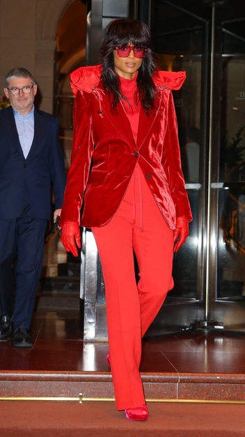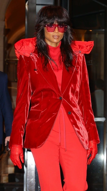 Сиара посетила показ Tom Ford в рамках Недели моды в Нью-Йорке. Для шоу звезда облачилась в красный тотал-лук в стиле 70-х. Сиара выбрала красные брюки и водолазку, поверх которых надела бархатный жакет приталенного кроя с капюшоном. Завершили наряд красные босоножки и крупные очки с цветными линзами.