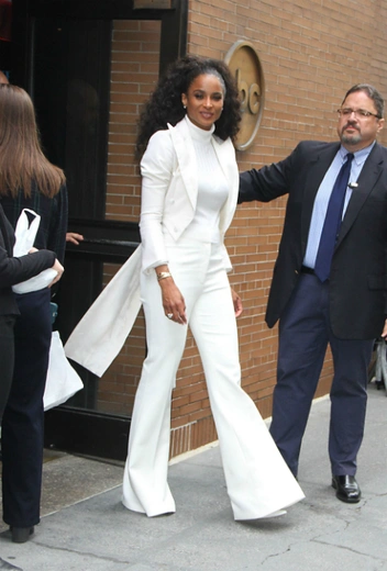 Наконец-то погода больше не ограничивает нас в цветовой палитре, и можно перейти к самым смелым сочетаниям. Берем пример с Сиары, которой эксперименты не чужды круглый год. 10 мая в Нью-Йорке певица появилась в тотальном белом наряде: водолазке, укороченном жакете со шлейфом и трендовых брюках-клеш. Вещи по крою – базовые и повседневные, однако белый цвет способен добавить помпезности даже в такой лаконичный аутфит.