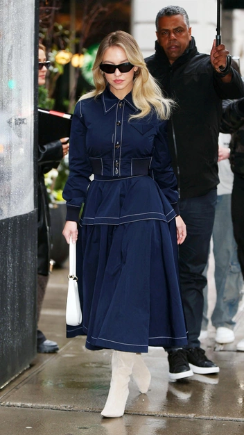 Знаменитость все чаще демонстрирует стильные образы и вдохновляет на модные эксперименты девушек по всему миру. Например, недавно она была замечена в эффектном темно-синем костюме с акцентными белыми полосами. Американская актриса примерила укороченную рубашку и пышную юбку в длине миди, к которым она подобрала яркие белые аксессуары: сапоги-слоучи и кожаную сумку на короткой ручке.