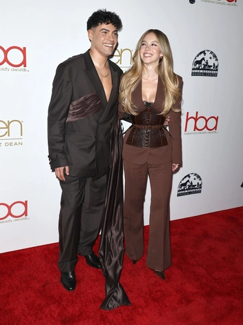 Бьюти-образ актрисы также сочетался с ее аутфитом: она предпочла смоки-айз с коричневой подводкой и акцент на губах, также коричнево-бежевого цвета. Глен надел свободный брючный костюм черного цвета, сквозь который проходила коричневая лента под цвет аутфита его спутницы. И, конечно, и Сидни, и Глен в тот день показали идеальную прическу: стилист уложил волосы кудрявым методом себе, а для своей клиентки выбрал более строгий образ с легкими локонами.