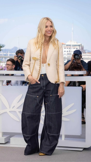 Мы привыкли видеть, как звезды во время Каннского кинофестиваля надевают роскошные платья и деловые брючные костюмы, но Сиенна Миллер всегда экспериментирует. Так, на премьере фильма «Горизонт: Американская сага» она появилась ультрамодном аутфите в Schiaparelli. Актриса примерила приталенный жакет на голое тело и дополнила его трендовыми синими джинсами на низкой посадке, из-под которых словно виднеется белье. Если присмотреться, то можно увидеть и эффектные туфли модного Дома — имитация ступни.