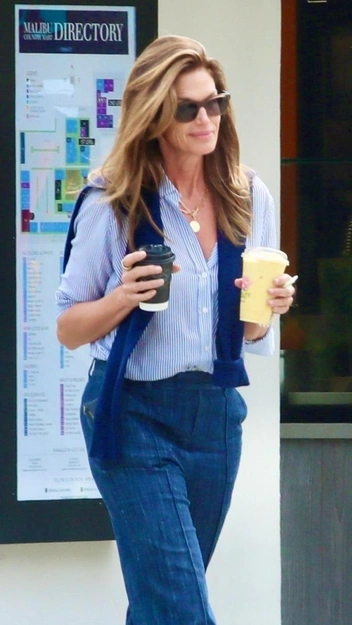 Синди Кроуфорд редко когда изменяет своему гардеробу — супермодель нашла безупречный стиль, который всегда будет актуален. Так, основой ее образов являются расклешенные джинсы на средней посадке, которые она чаще всего носит с рубашками в мужском стиле. На этот раз знаменитость дополнила аутфит коричневыми босоножками на толстом каблуке, очками и повесила на плечи синий джемпер в качестве акцента.