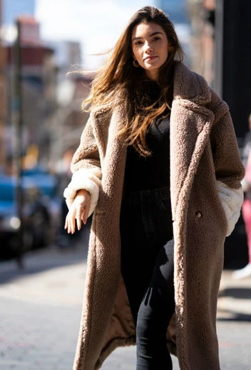 Плюш прекрасно смотрится как зимой, так и в начале весны, когда доставать тренч рано, а убрать шубу в гардероб уже очень хочется. Синди выбрала бежевое пальто с белыми рукавами, которые составили стильное цветовое сочетание с белыми ботильонами на высоком каблуке. Обувь белого цвета была в топе трендов прошедшей зимы, а если расставаться с ней не хочется, можно продлить роман покупкой экстра-пары белых лодочек или оксфордов.