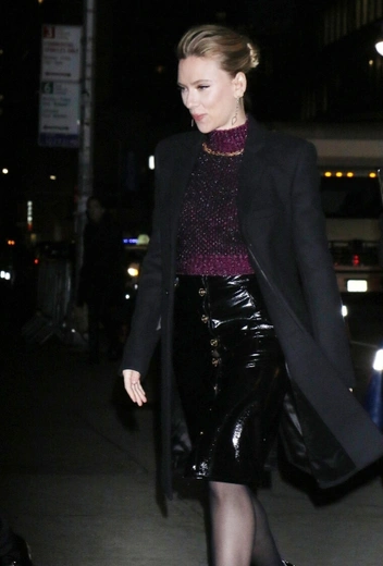 На вечерних ток-шоу мы часто видим селебрити, одетых не хуже, чем на красной дорожке какой-нибудь кинопремии. Однако не все знаменитости следуют такой тенденции и любят появиться перед телекамерами в обычных повседневных образах, в которых они могут как забежать за кофе, так и отправиться на бизнес-встречу. Недавний выход Скарлетт Йоханнсон на шоу со Стивеном Кольбером — наглядный тому пример. На съемочную площадку актриса приехала в комбинации из черной кожаной юбки миди, которую дополнил фиолетовый свитер, классическое пальто и черные туфли-лодочки — просто, но со вкусом.
