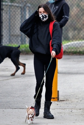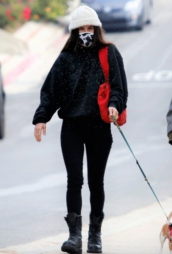 В последнее время дочь Деми Мур и Брюса Уиллиса все активнее утверждает за собой статус первой модницы Лос-Анджелеса и делает это по-своему оригинально, представляя авторское прочтение как вечной классики, так и актуальных трендов. Например, повседневный образ в total-black девушка предпочитает выгуливать в комфортном урбан-стиле: облегающие джинсы и оверсайз-кофту знаменитость дополняет массивными ботинками на шнуровке, объемной красной сумкой и защитной маской с коровьим принтом — простой и модный вариант аутфита на каждый день.