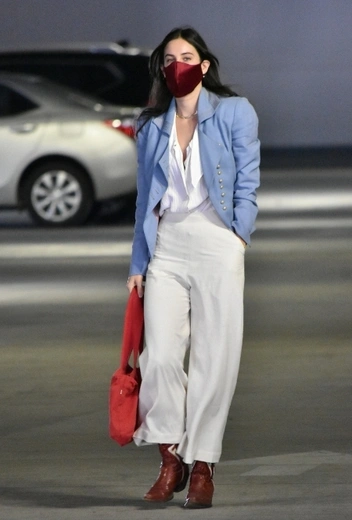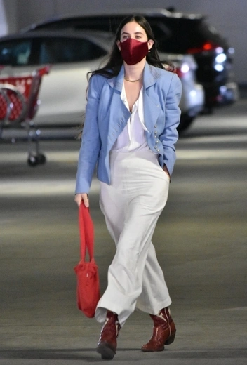 Из всех дочерей Деми Мур и Брюса Уиллиса Скаут Уиллис увлечена модой сильнее всех и часто удивляет обозревателей смелыми стритстайл-выходами. Девушка отдает предпочтение расслабленным фасонам, неформальной классике и легким летящим тканям. Так, знаменитость сочетает брючную комбинацию из широких брюк и блузы в белом цвете с голубым тканевым жакетом и коричневыми сапогами. Скаут дополняет лук сумкой и бархатной защитной маской в оттенках красного.