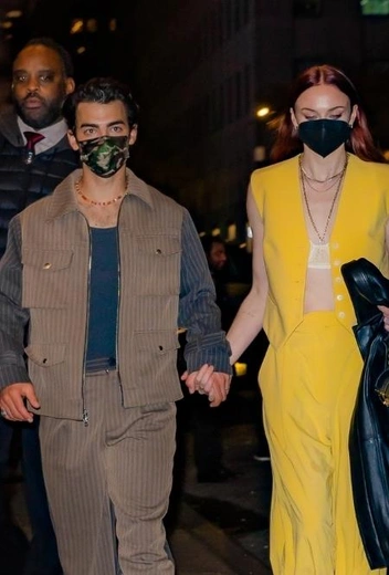 Дуэт Джо Джонаса и Софи Тернер всегда приковывает к себе повышенное внимание модных фотографов, и не зря: их считают одними из самых популярных трендсеттеров модной столицы США, а совместные выходы двух звезд действительно получаются очень оригинальными. Очередное яркое появление парочка совершила на днях на вечеринке SNL. Софи и Джо появились на мероприятии в брючных костюмах: Софи — в желтой комбинации с жилетом и бра, Джо — в бежевом наряде из плотной ткани. Знаменитости дополнили образы защитными масками.