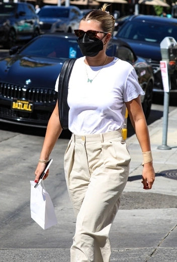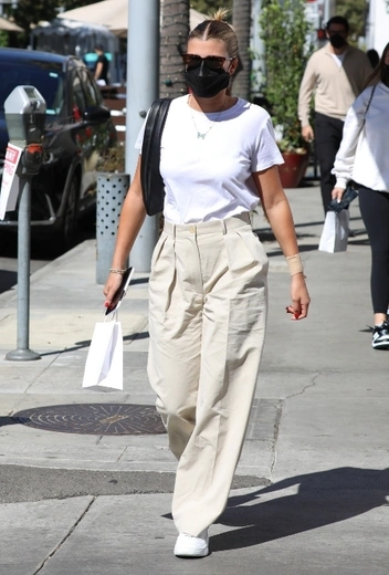 Монохромные аутфиты в светлых тонах продолжают оставаться классикой летнего гардероба и получать бесконечное количество интерпретаций в звездном стритстайле. Для таких луков отлично подходят легкие ткани и расслабленные фасоны, которые обеспечивают лаконичность и легкость образа. София Ричи изменяет любимому total-white и удачно разбавляет его кремовым оттенком. Знаменитость сочетает базовую футболку с брюками на высокой посадке и белыми кроссовками в тон верха, дополняя образ черной сумкой на одно плечо и солнцезащитными очками.