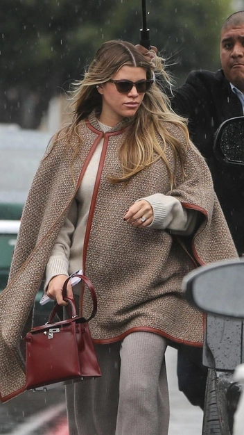 София Ричи — амбассадор «тихой роскоши», чему она не изменяет и будучи в положении. Для выхода знаменитость выбрала простой, но стильный образ: она надела лаконичный свитер в молочном оттенке и застилизовала его с трендовыми трикотажными серыми брюками. Яркой деталью в образе стало коричневое пончо с кожаной отделкой, которое выглядит эффектно и дорого, а также элегантная сумка.