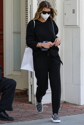 Нет ничего практичнее, чем иметь в гардеробе парочку комбинаций в тотальном черном, особенно если речь идеть о повседневных выходах. А еще лучше, если некоторые из них учитывают закономерности вашего настроения: так, чтобы когда вам не до гламура и шика, вы могли легко почувствовать себя уютно в самом универсальном колор-варианте цветовой палитры. София Ричи предпочитает выгуливать total-black в исполнении полуспортивного костюма и делает ставку на расслабленный фасон, дополняя лук черно-белыми слипонами, мини-сумкой и солнцезащитными очками.