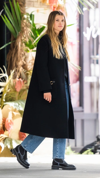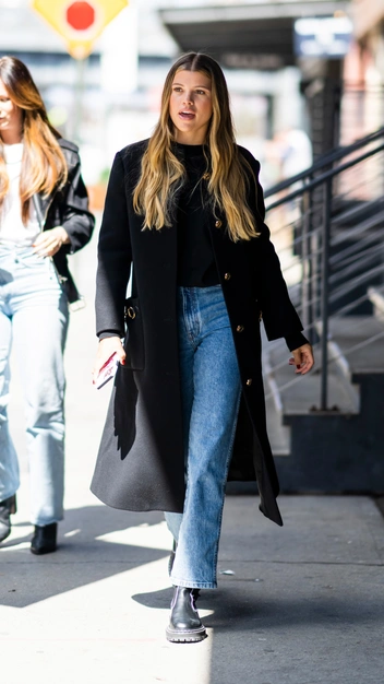 София Ричи собрала актуальный образ на весну, за основу которого взяла черное пальто свободного кроя. Такая модель всегда выглядит эффектно и дорого, помогая преобразить весь аутфит целиком. К пальто София добавила прямые голубые джинсы, черный джемпер и кожаные челси с контрастной строчкой и тракторной подошвой.