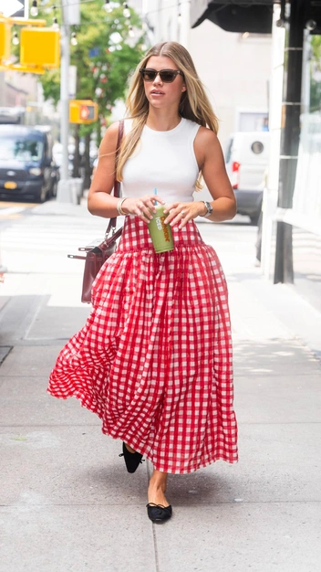 Клетка в женском гардеробе — классика жанра, но что если пересмотреть ее традиционное прочтение и выбрать необычный вид? София Ричи демонстрирует безупречный вкус и выбирает для своих образов пышную юбку на широком поясе в красно-белую клетку виши. Носить такой предмет гардероба осмелятся яркие и стильные девушки, поэтому предлагаем и вам примерить актуальный тренд. Дополнить акцентную юбку стоит более спокойным верхом: знаменитость, например, выбрала базовый белый топ.