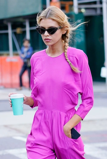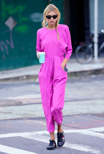 Простой крой иных вещей с лихвой компенсирует их яркий цвет: розовый комбинезон-роба Стеллы Максвелл — отличная иллюстрация этого тезиса. Захотите повторить этот образ — не забывайте про аксессуары: топ-модель, например, дополняет его парой солнцезащитных очков от Moschino и черными кедами.