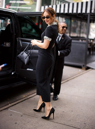 Который сезон все трендбуки бьет сумка такса, как от бренда Alaia, и осень 2025 не стала исключением. Ее отличают длинные ручки и вытянутый силуэт в форме прямоугольника — лучший пример нашелся у Лили Аллен. Девушка сочетала сумку с платьем в деловом стиле с акцентным воротником и лодочками из замши, но подойдут и более расслабленные комбо — со спортивными брюками, джинсами и осенним пальто.