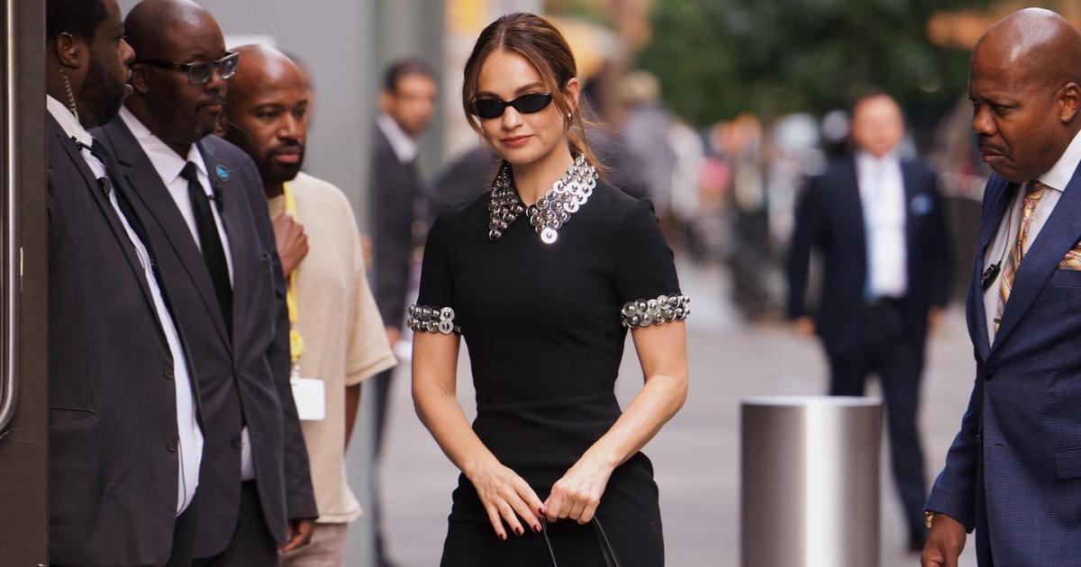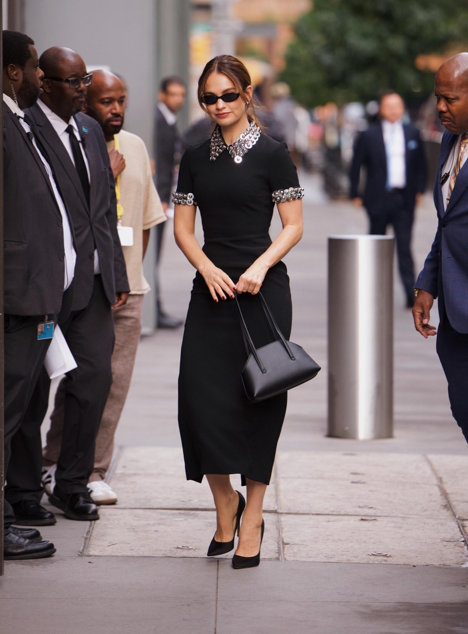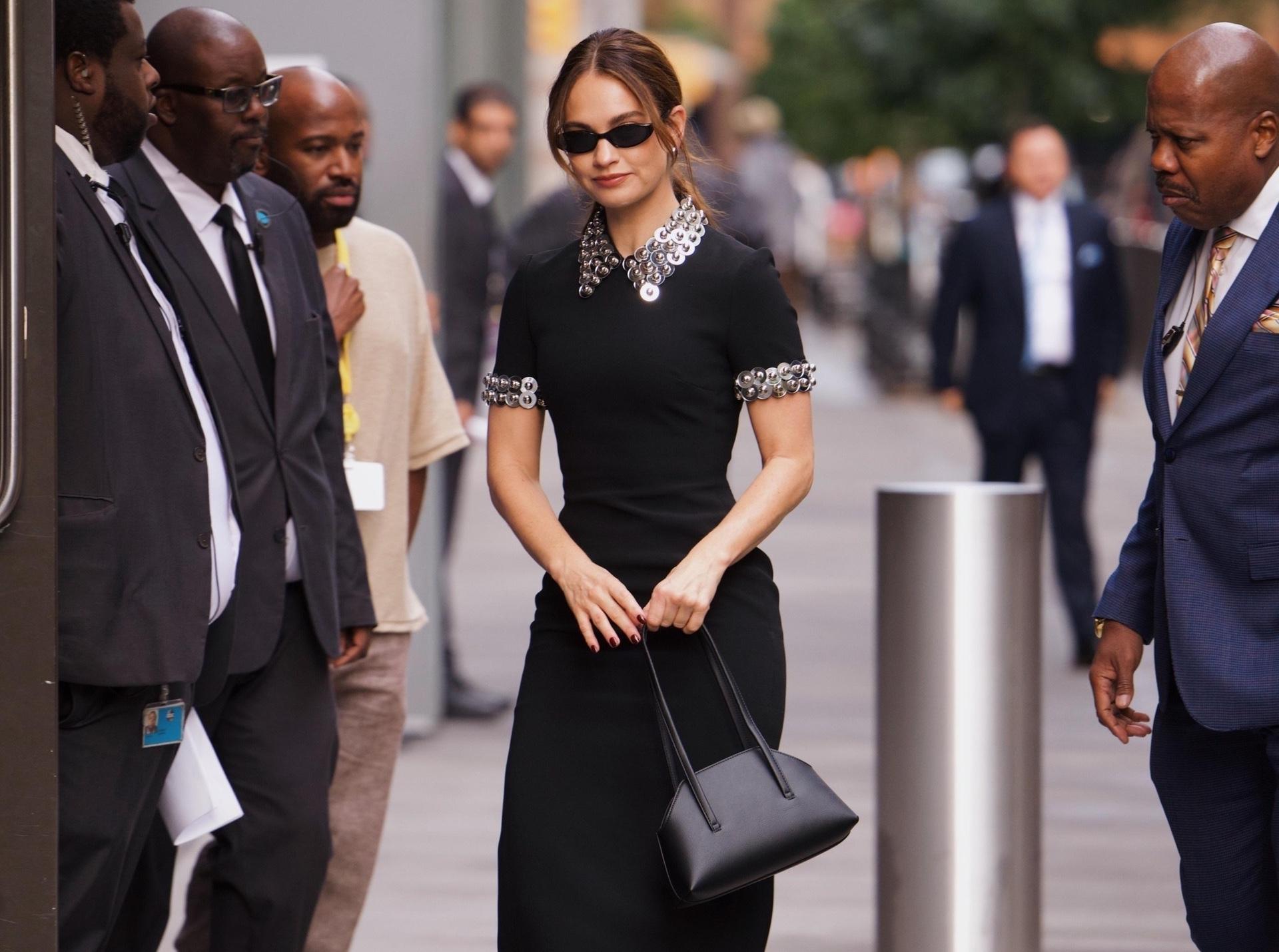 Который сезон все трендбуки бьет сумка такса, как от бренда Alaia, и осень 2025 не стала исключением. Ее отличают длинные ручки и вытянутый силуэт в форме прямоугольника — лучший пример нашелся у Лили Аллен. Девушка сочетала сумку с платьем в деловом стиле с акцентным воротником и лодочками из замши, но подойдут и более расслабленные комбо — со спортивными брюками, джинсами и осенним пальто.